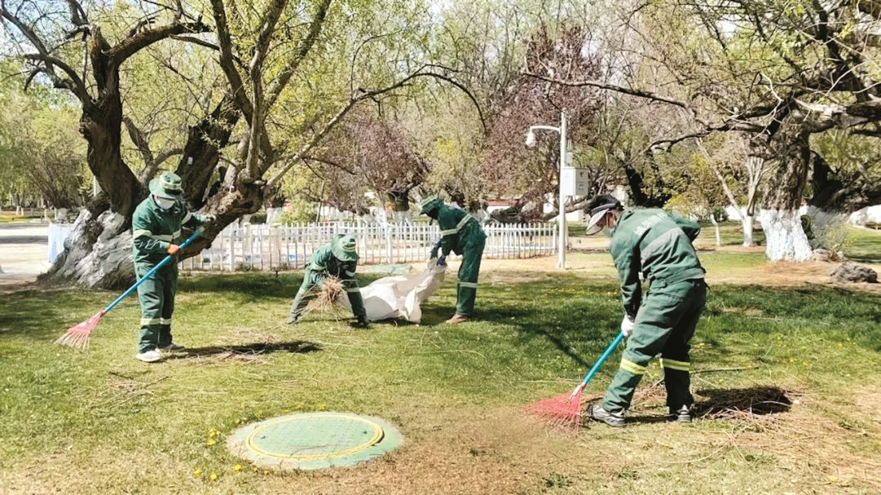通過(guò)此次管養(yǎng)工作,共清理羅布林卡公園渣土死苗0.3噸,澆灌清水58.5噸,確保了園林植被春季正常生長(zhǎng)。