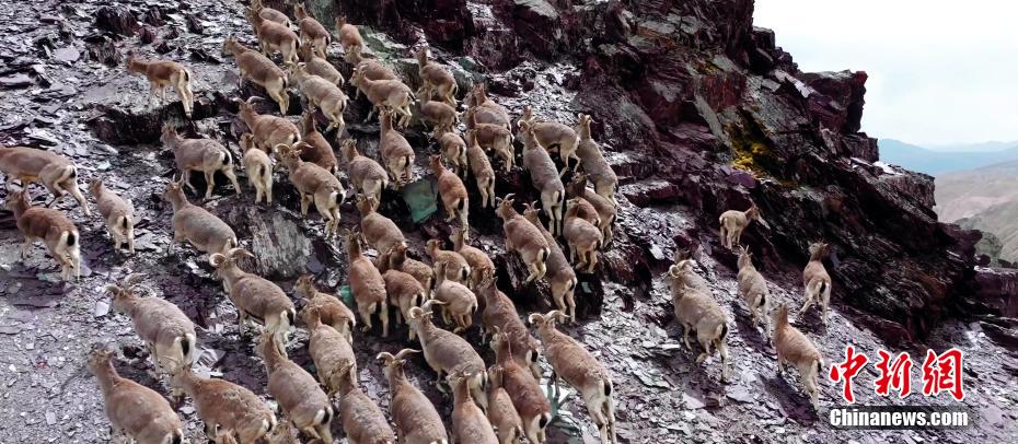 在青藏高原,春夏季氣溫較東部地區(qū)低,由于海拔較高,祁連山頂積雪常年不化。雖然近日降溫,但野生動(dòng)物已感受到夏日來臨。圖為正在爬山的巖羊群。 馬志原 攝