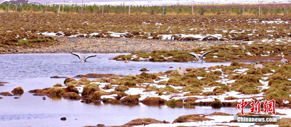 圖為斑頭雁等鳥類在濕地飛舞覓食。馬志原 攝