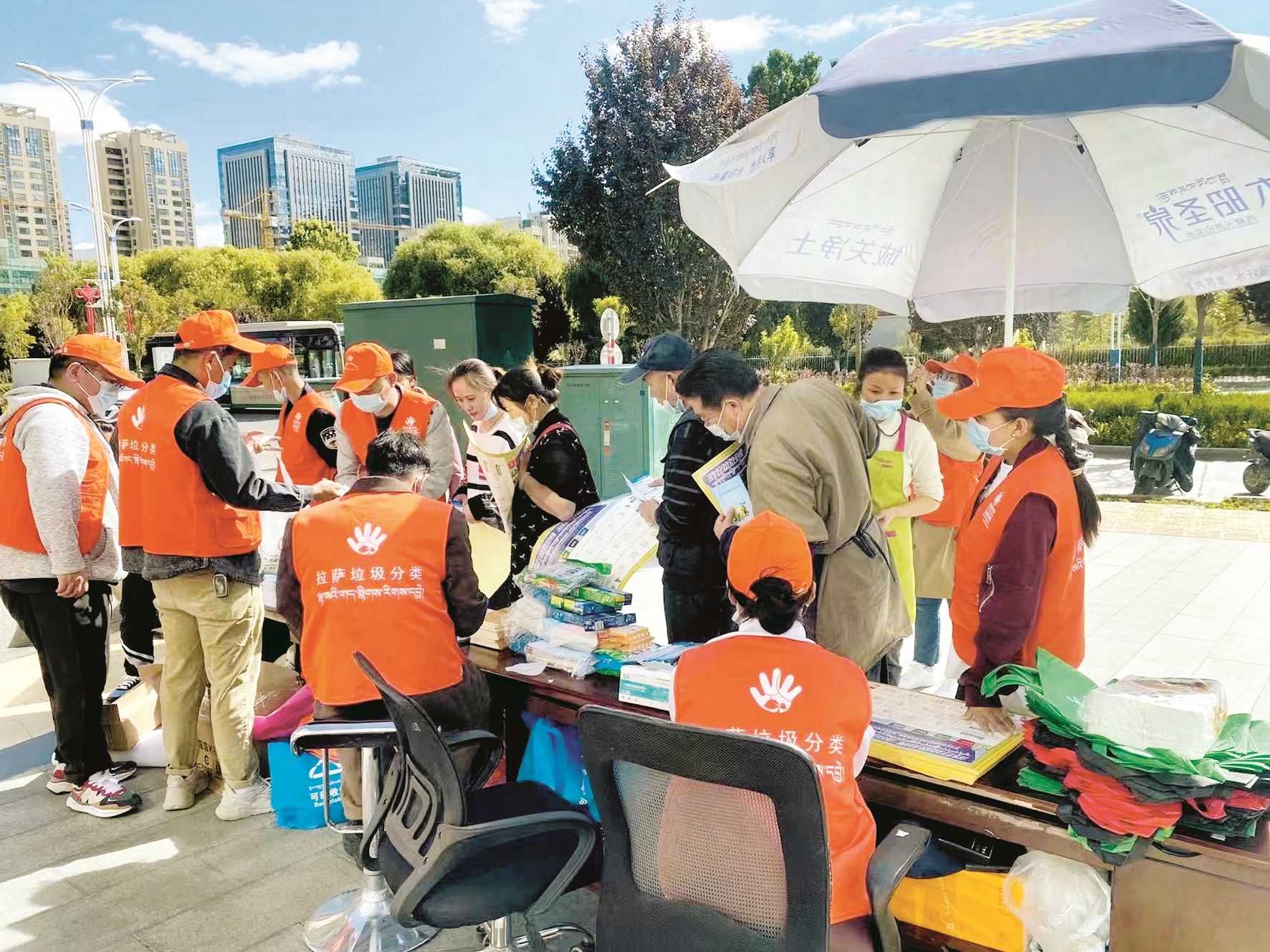 圖為工作人員向過往市民發(fā)放垃圾分類宣傳品。 (圖片由市分類辦提供) 拉薩融媒記者 范江英