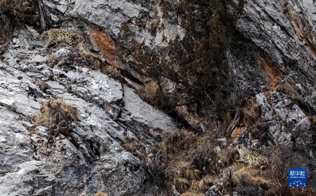 2月21日,在青海省玉樹(shù)藏族自治州雜多縣昂賽鄉(xiāng)境內(nèi)的昂賽大峽谷內(nèi),兩只雪豹在向上攀爬。新華社記者 費(fèi)茂華 攝
