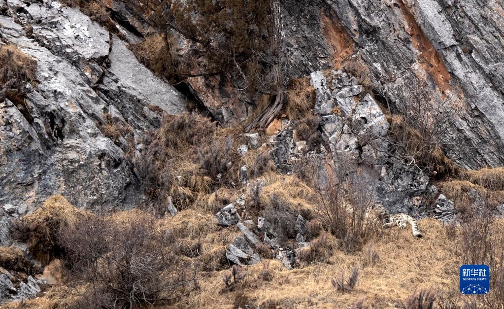 2月21日,在青海省玉樹(shù)藏族自治州雜多縣昂賽鄉(xiāng)境內(nèi)的昂賽大峽谷內(nèi),一只雪豹正在休息。新華社記者 張宏祥 攝