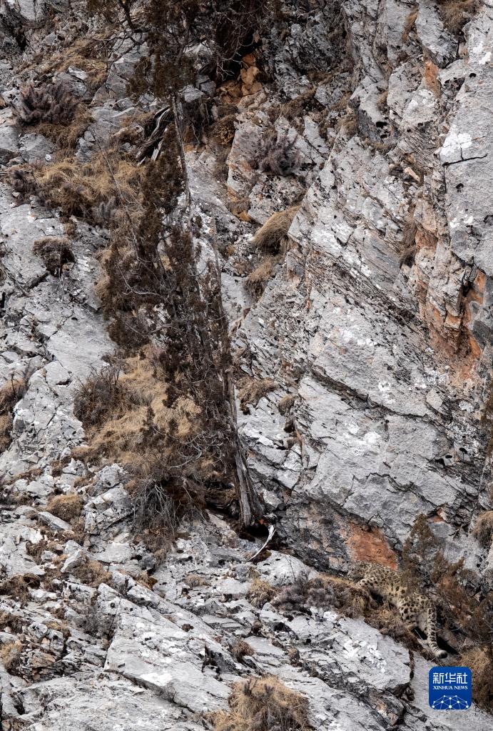 2月21日,在青海省玉樹(shù)藏族自治州雜多縣昂賽鄉(xiāng)境內(nèi)的昂賽大峽谷內(nèi),一只雪豹在向上攀爬。新華社記者 費(fèi)茂華 攝