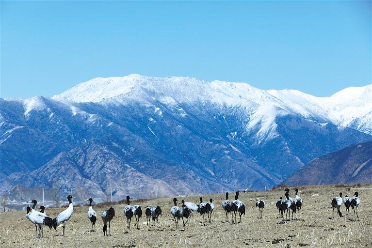 國(guó)家一級(jí)保護(hù)動(dòng)物黑頸鶴在墨竹工卡縣境內(nèi)的農(nóng)田里覓食。