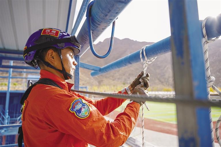 迅速打好繩結(jié)、扣好安全帶……27歲的仁增論珠身著全套戰(zhàn)訓(xùn)服,正在進(jìn)行繩索下降訓(xùn)練。身姿矯健、動(dòng)作干凈利落,眨眼間,他已安全降至地面。仁增論珠從小就有個(gè)當(dāng)兵夢,2015年,他應(yīng)征入伍,三年部隊(duì)生活錘煉了他的體能和意志。2019年,仁增論珠入職自治區(qū)森林消防總隊(duì),成為一名消防戰(zhàn)士,繼續(xù)為保家衛(wèi)國貢獻(xiàn)自己的力量。