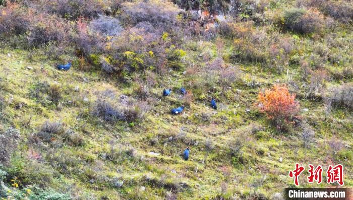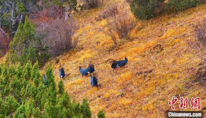 圖為一群藍(lán)馬雞在山坡上覓食。 曹民鍇 攝