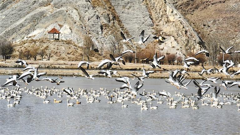 近年來,西藏不斷加強野生動物保護力度,全面提升自然保護區(qū)基礎(chǔ)設(shè)施、管理水平,健全完善野生動物保護法律法規(guī),野生動物保護工作取得顯著成效。隨著各族干部群眾保護意識不斷增強,斑頭雁、赤麻鴨、紅嘴鷗等大量保護動物都會飛到西藏過冬,它們聚集在西藏的各個湖畔,時而凌空盤旋、時而悠閑踱步,鳥鳴聲此起彼伏,構(gòu)成了冬日里一道美麗的風景。