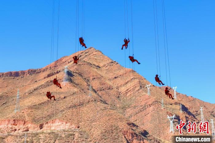 比賽現(xiàn)場(chǎng),消防員運(yùn)用一對(duì)一掛接救援技術(shù)將被困者安全下放至地面。姚天銳 攝