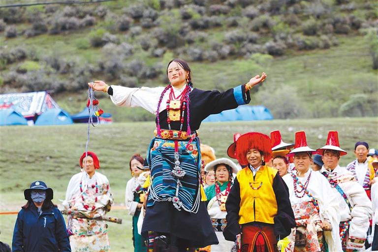 開幕式結(jié)束后,“春踏林周·悅賞杜鵑”——2024林周縣“春賞杜鵑”生態(tài)藝術(shù)共享季系列活動開始。為了給廣大游客提供專業(yè)的旅拍服務(wù),主會場的杜鵑花賞花點被巧妙地轉(zhuǎn)化為一個充滿自然韻味的“攝影棚”,并推出“非遺”服飾體驗,讓游客更深入地感受和體驗當(dāng)?shù)貍鹘y(tǒng)文化的魅力。同時,圍繞林周縣北部的生態(tài)環(huán)境、藝術(shù)人文和“非遺”文化等設(shè)計開展了徒步旅游活動,活動融合“農(nóng)文旅體”等內(nèi)容,從專業(yè)性的內(nèi)容植入、技能型的活動設(shè)計等方面來增強(qiáng)徒步旅游的品質(zhì)。旁多鄉(xiāng)的達(dá)龍藏戲、唐古鄉(xiāng)的熱振曲卓、阿朗鄉(xiāng)的“果諧”還給觀眾帶來了精彩的“非遺”表演。