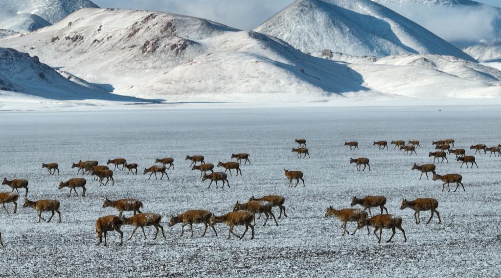 這是在甜水河畔荒灘雪地中向產羔地遷徙的藏羚羊(6月15日攝 無人機照片)。新華社記者 晉美多吉 攝