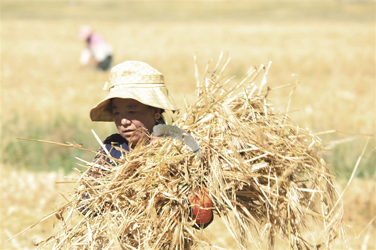 金秋九月,風(fēng)吹麥浪、穗粒飽滿(mǎn),連日來(lái),在墨竹工卡縣金黃色的農(nóng)田里,處處可見(jiàn)勤勞的農(nóng)民們搶抓時(shí)機(jī),開(kāi)展小油菜和青稞收割、晾曬、搬運(yùn)、儲(chǔ)藏,確保糧食顆粒歸倉(cāng)。