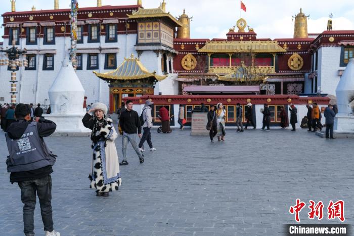 11月28日下午,游客在拉薩大昭寺廣場(chǎng)拍攝服裝寫真。 中新社記者 江飛波 攝