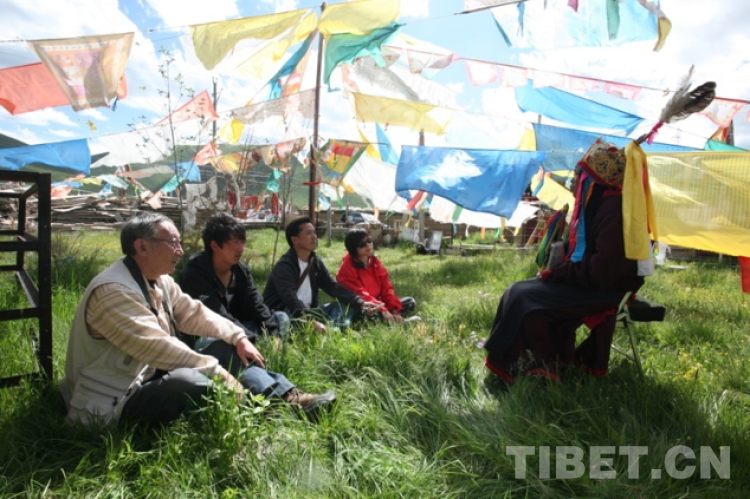 圖為2010年7月,說唱藝人俄珍卓瑪在家中庭院里為我們說唱她從石頭里看到的史詩《格薩爾》。楊嘉銘先生為前一,紅衣者為作者,旁左為色達(dá)縣文化旅游局副局長四朗彭措。