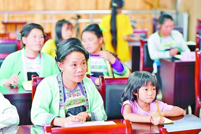 9月12日,在桂黔交界的大苗山深處,代時(shí)英和女兒在烏英苗寨“雙語雙向”培訓(xùn)班聽課。新華社發(fā)