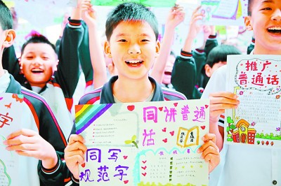 9月17日,河南靈寶市解放小學(xué)學(xué)生用手抄報(bào)形式宣傳推廣普通話。劉曉偉攝/光明圖片