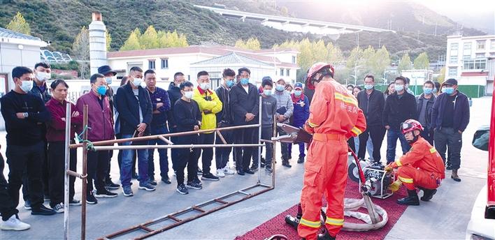 圖為工布江達(dá)縣消防救援大隊(duì)指戰(zhàn)員在為密集場所從業(yè)人員進(jìn)行消防器材操作示范。姜偉 攝