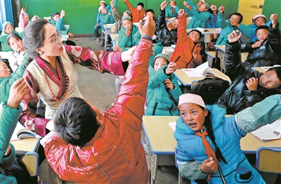 教學(xué)中,桑丁卓瑪注意活躍課堂氣氛,調(diào)動學(xué)生的學(xué)習(xí)積極性。一堂漢語文課上,她引導(dǎo)學(xué)生根據(jù)課文描述,模仿主人公拉弓射箭的動作。