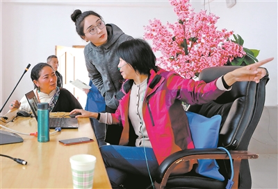 培訓(xùn)過程中,授課專家、中國教育科學(xué)研究院教師發(fā)展研究所副所長卿素蘭博士(右一)由于高原反應(yīng),身體出現(xiàn)不適,桑丁卓瑪臨時客串起“助教”,幫助調(diào)試教學(xué)設(shè)備、進(jìn)行范文朗讀等。