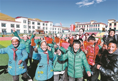 和學(xué)生們在一起,是桑丁卓瑪最開心的時刻。她專門給學(xué)生帶來國旗、國旗貼,為他們講述國旗下民族團(tuán)結(jié)好故事。