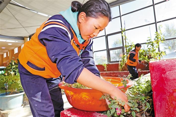 日喀則市上海實(shí)驗(yàn)學(xué)校的學(xué)生在種植專業(yè)課上學(xué)習(xí)種植花卉。