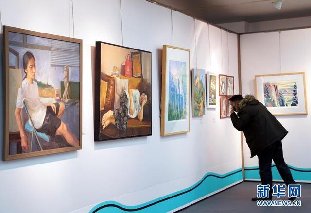 12月15日,參觀者在觀看大學(xué)生繪畫作品。