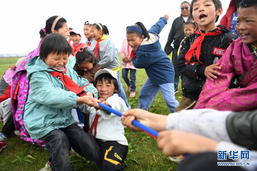7月14日,河曲馬場(chǎng)小學(xué)的孩子們?cè)诓菰线M(jìn)行拔河比賽。新華社記者 陳斌 攝