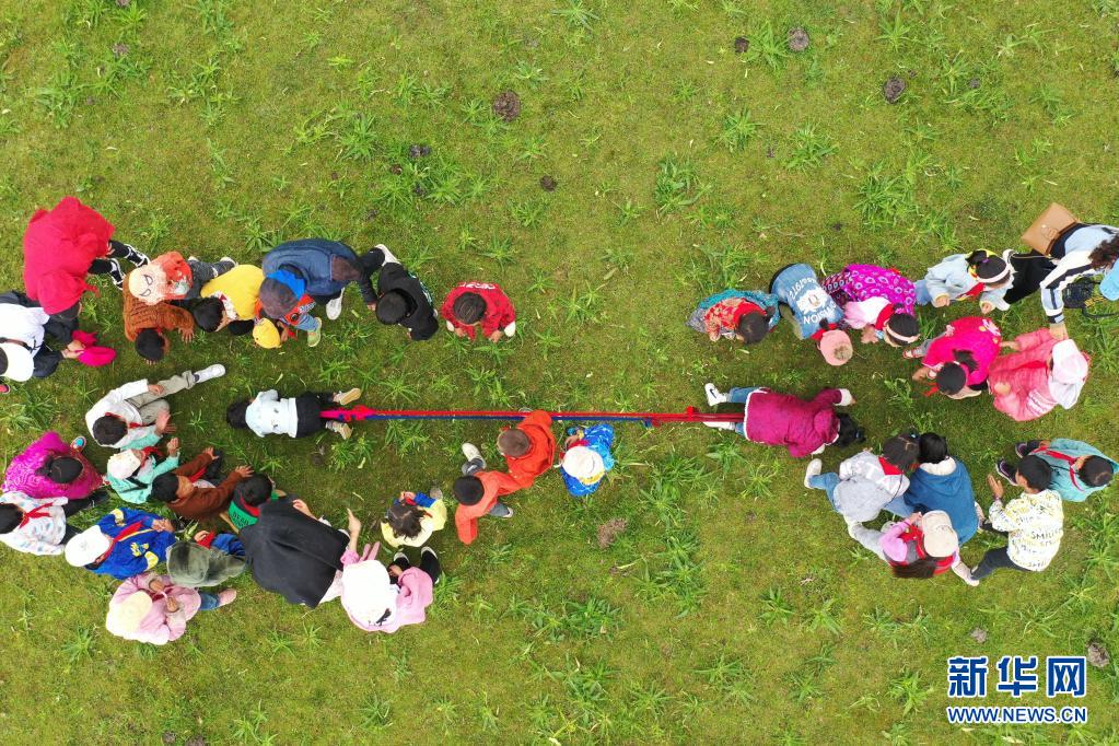 7月14日,河曲馬場(chǎng)小學(xué)的孩子們?cè)诓菰线M(jìn)行拔河比賽(無(wú)人機(jī)照片)。新華社記者 杜哲宇 攝
