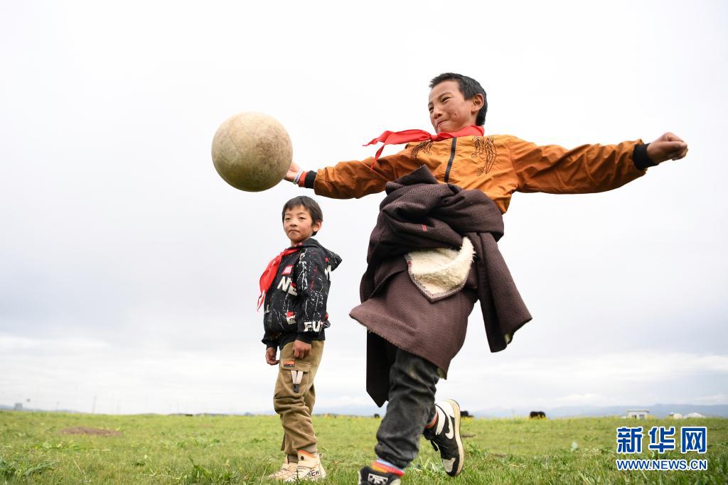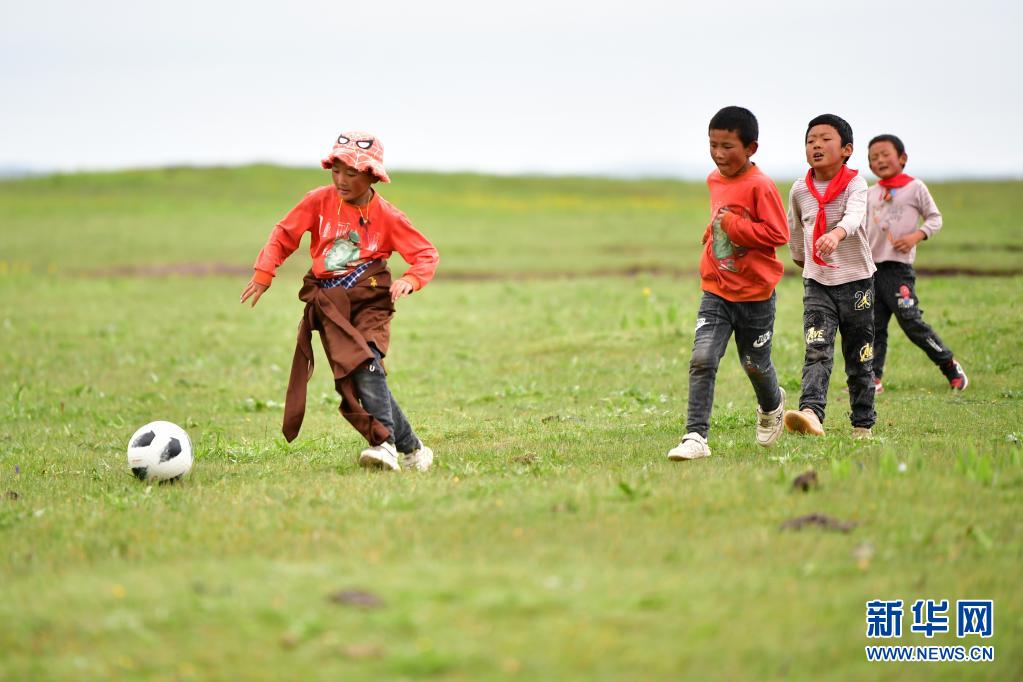 7月14日,河曲馬場(chǎng)小學(xué)學(xué)生參交羅布藏(右)和同伴在草原上踢足球。新華社記者 陳斌 攝