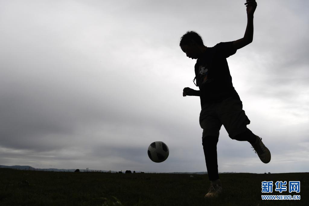 7月14日,河曲馬場(chǎng)小學(xué)學(xué)生丹增喇巴在草原上踢足球。新華社記者 陳斌 攝