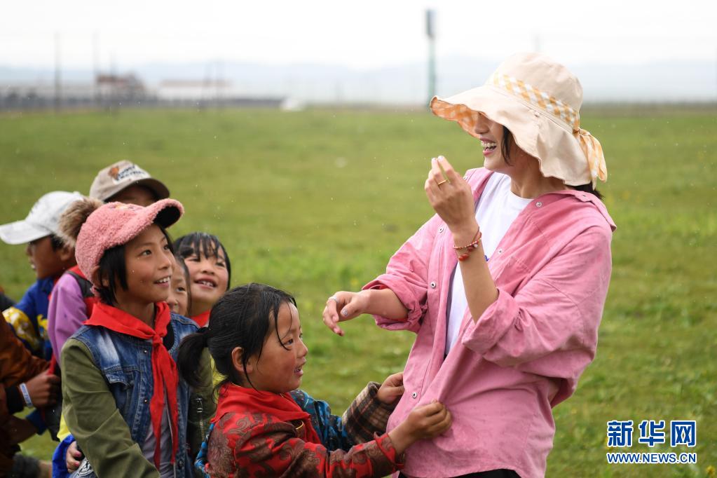 7月14日,河曲馬場(chǎng)小學(xué)老師余妙妍(右一)在草原上和孩子們做游戲。新華社記者 陳斌 攝