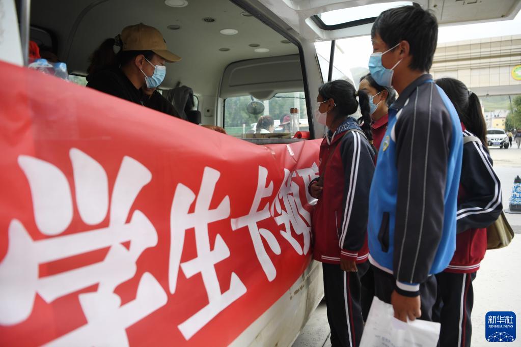 碌曲縣藏族中學(xué)高一新生帶著行李通過測(cè)溫門到學(xué)校報(bào)到(8月30日攝)。新華社記者 陳斌 攝