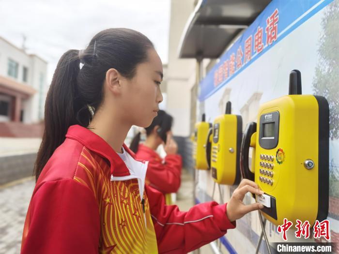 圖為臨潭一中學(xué)生王若玉刷電子校徽給家人打電話(huà)?!堟?攝