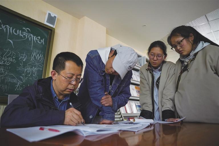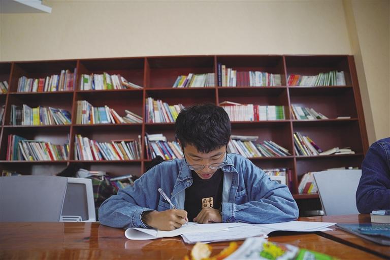 除了教室,閱覽室也是學(xué)習(xí)的好地方。在閱覽室,不少同學(xué)正奮筆疾書,只聽(tīng)得見(jiàn)書頁(yè)翻動(dòng)和筆尖書寫的“沙沙”聲。陽(yáng)光透過(guò)玻璃傾瀉在書桌上,暖暖地照在這些青春的面龐,把他們點(diǎn)綴成五月里最美的風(fēng)景。閱覽室的最里邊,一位老師正在認(rèn)真講解試卷上的難題,不一會(huì)兒同學(xué)們就露出了恍然大悟的表情。“我很喜歡來(lái)閱覽室學(xué)習(xí),這兒比教室更安靜些,可以讓我靜下心來(lái)做題。”學(xué)生扎西江村說(shuō)。