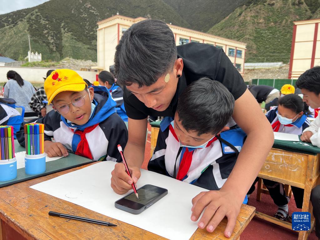 西藏大學美術專業(yè)學生為工布江達縣小學孩子們輔導繪畫。(受訪者供圖)