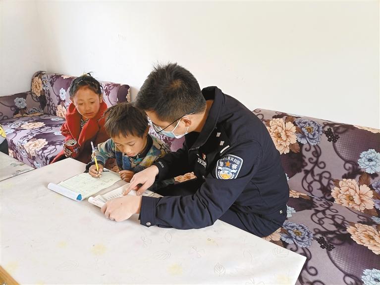 “老師,小扎西最近在學(xué)校表現(xiàn)的怎么樣?”扎西江措在上察隅鎮(zhèn)小學(xué)上一年級,這個年齡段的孩子,最是調(diào)皮的時候,每當(dāng)派出所民警下鄉(xiāng)走訪經(jīng)過學(xué)校時,都會找到小扎西的班主任詢問最近狀況。孩子們?nèi)粘W(xué)習(xí)、生活中的一舉一動,不僅牽動著派出所民警的心,也牽動著遠在千里之外駐村民警化旦的心?!翱络?,孩子們最近還好嗎?我看物流信息顯示圖書和零食已經(jīng)到了,你們下鄉(xiāng)的時候就把東西帶過去……”2020年,化旦分配到上察隅邊境派出所,喜歡孩子的他,迅速和扎西、拉姆打成一片,平時只要有空便帶著學(xué)習(xí)、生活用品去看他們,為了迎合孩子們的興趣愛好,化旦也會從網(wǎng)上學(xué)習(xí)兒童歌曲、舞蹈,與孩子們一起唱歌跳舞。