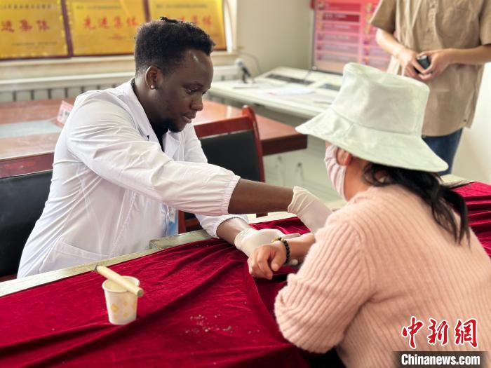 長沙醫(yī)學(xué)院的留學(xué)生們?yōu)榍皝砭驮\的村民測量血壓血糖、艾灸等,中國學(xué)生的中醫(yī)組則是通過望聞問切的方式問診、把脈,認(rèn)真聆聽既往病史,解答村民問題,出具診療意見。