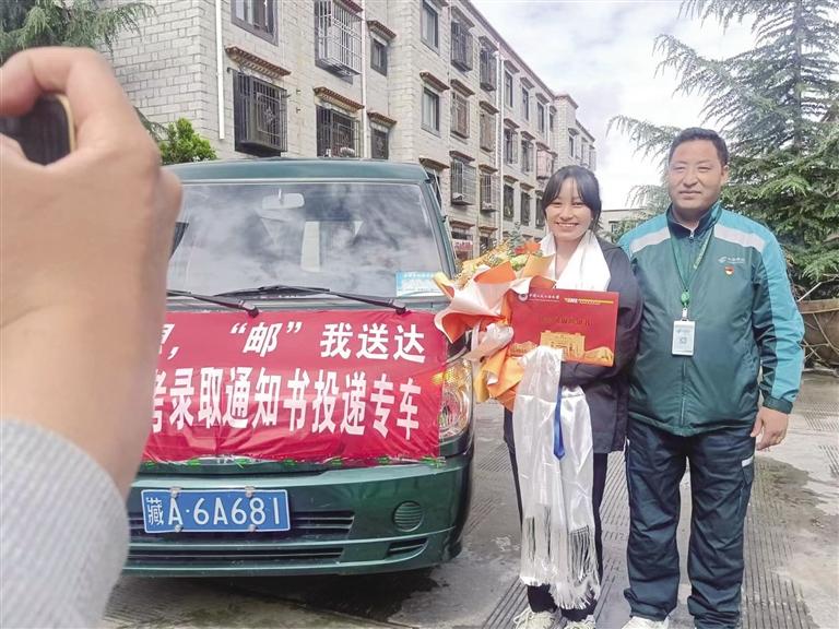 “喂,你好,請(qǐng)問(wèn)是白瑪玉珍同學(xué)嗎?我是拉薩郵政的,您有中國(guó)人民公安大學(xué)的錄取通知書(shū),我們馬上要投遞了,請(qǐng)您準(zhǔn)備一下準(zhǔn)考證和身份證?!?月18日上午10時(shí)許,在投遞錄取通知書(shū)之前,中國(guó)郵政集團(tuán)有限公司拉薩市分公司教育城營(yíng)業(yè)部經(jīng)理吳金致電考生白瑪玉珍,讓她做好接收準(zhǔn)備。隨后,吳金駕駛一輛貼有“您的理想‘郵’我送達(dá)”橫幅的西藏郵政高考錄取通知書(shū)投遞專(zhuān)車(chē)出發(fā),前往白瑪玉珍家所在的扎基小區(qū)進(jìn)行投遞。來(lái)到白瑪玉珍家樓下,在仔細(xì)核對(duì)相關(guān)證件后,吳金將錄取通知書(shū)遞給白瑪玉珍。與此同時(shí),中國(guó)郵政集團(tuán)拉薩市分公司運(yùn)營(yíng)管理部經(jīng)理羅布次仁等人則為她獻(xiàn)上哈達(dá),送上祝福和鮮花。