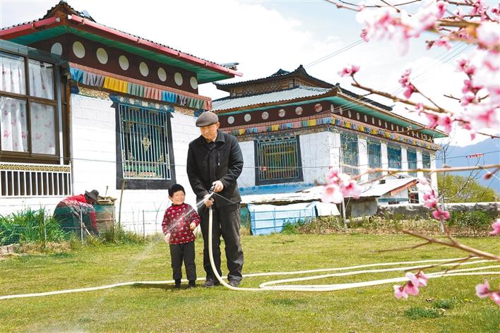 圖為巴宜區(qū)米瑞鄉(xiāng)通麥村村民扎西格勒在自家庭院給草坪灑水。見(jiàn)習(xí)記者 胡文 攝