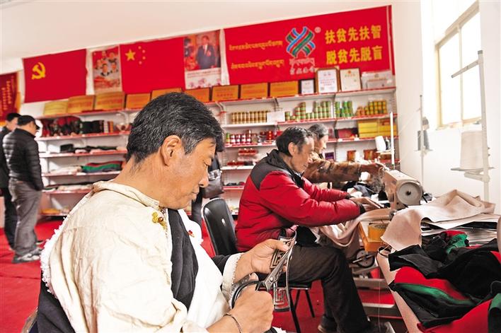 圖為巴青縣阿秀鄉(xiāng)達麥村牧民經(jīng)濟合作社負責(zé)人次仁旺布(右三)帶領(lǐng)群眾制作手工藝品。記者 謝偉 攝