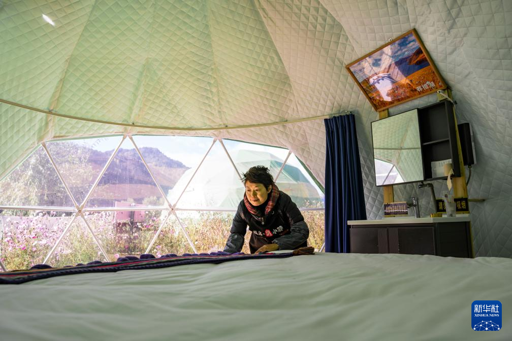 工作人員在西藏芒康縣如美鎮(zhèn)拉烏村一座星空帳篷內(nèi)收拾床鋪(10月20日攝)。新華社記者 孫非 攝