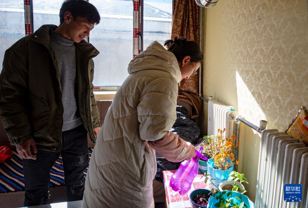 距離太陽(yáng)能集熱場(chǎng)約3公里外的縣職工周轉(zhuǎn)房小區(qū)是供暖工程的最遠(yuǎn)端,年輕夫妻曲珠(左)和央次仁在家中侍弄花草(1月6日攝)。新華社記者 姜帆 攝