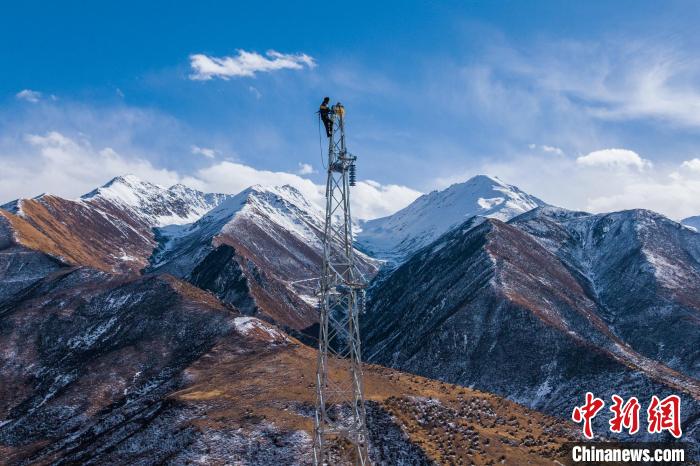 2023年11月30日,西藏索縣榮布至丁青縣巴達35千伏線路工程施工人員正在開展塔上作業(yè)。趙清鵬 攝