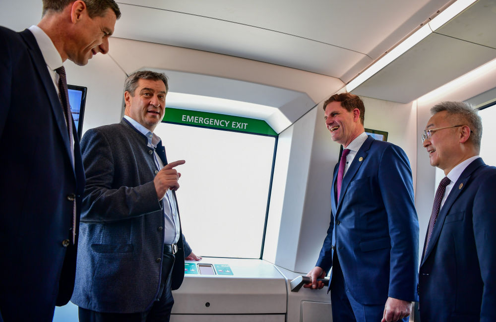德國(guó)巴伐利亞州州長(zhǎng)索德?tīng)枺ㄗ蠖┮恍畜w驗(yàn)中德合作的磁懸浮成都試驗(yàn)線。新華社記者張超群攝