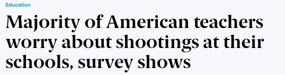 報(bào)道稱(chēng),2023年,美國(guó)發(fā)生的校園槍擊事件數(shù)量達(dá)到了歷史新高。在接受皮尤調(diào)查的受訪(fǎng)者中,59%的人對(duì)校園槍擊表示擔(dān)心,其中18%的人說(shuō)自己對(duì)此感到“非?!被蛘摺皹O度”擔(dān)心。只有7%的受訪(fǎng)教師稱(chēng),他們完全不擔(dān)心校園槍擊的發(fā)生。