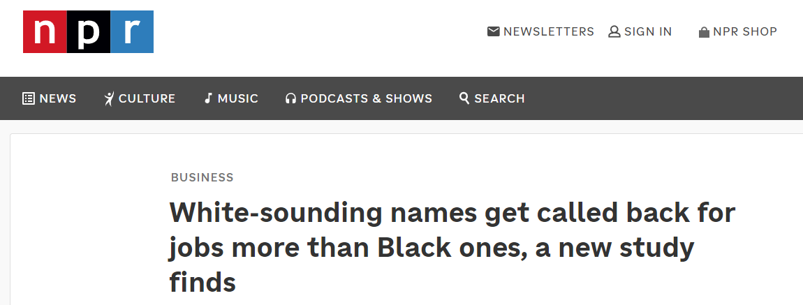 據(jù)美國全國公共廣播電臺(NPR)網(wǎng)站報道,研究人員向約100家美國企業(yè)的11000個初級職位投遞了履歷相同,但個人信息(姓名、性別等)不同的83000份“偽造”簡歷。研究發(fā)現(xiàn),名字聽起來“像白人”的求職者被招聘方回復(fù)的概率更高,比名字“像黑人”的求職者平均高9.5%。在一些情況更嚴重的企業(yè),這一差距上升到約24%。