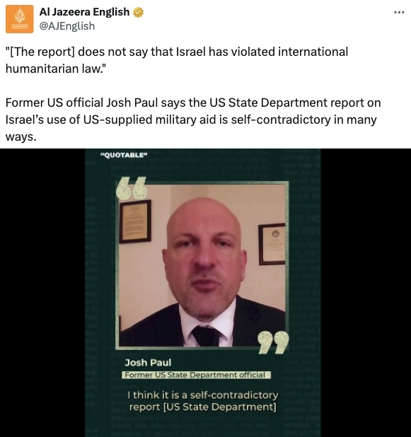 因不滿拜登政府巴以政策而于去年10月辭職的美國國務院政治軍事事務局前主任喬希·保羅認為,這是一份自相矛盾的報告,沒有從所確定的事實中得出合乎邏輯的結論。