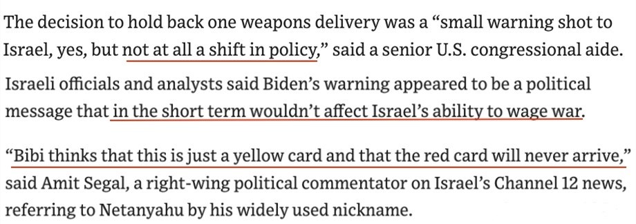 “比比(內塔尼亞胡的昵稱)相信拜登只是對他亮出了一張黃牌,而紅牌永遠不會到來。”