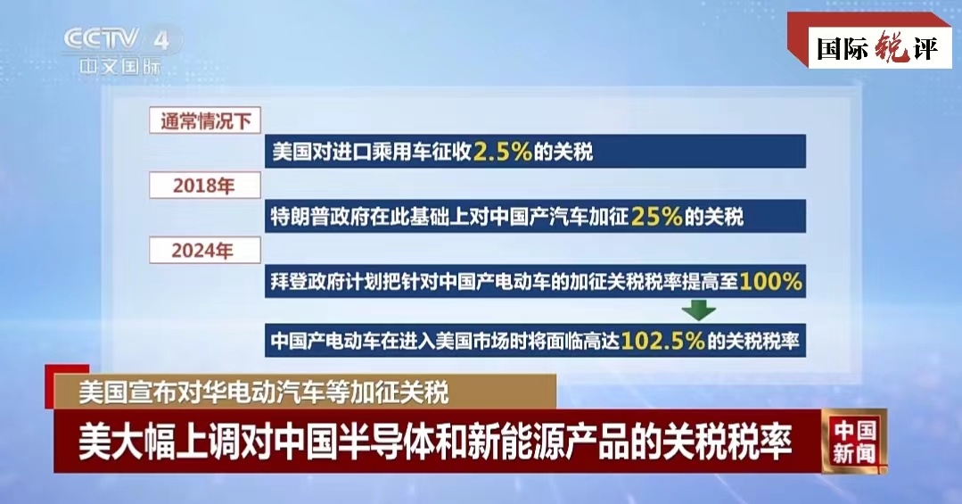 2018年3月,美國時(shí)任特朗普政府依據(jù)所謂“301調(diào)查”挑起對(duì)華貿(mào)易戰(zhàn),先后對(duì)約3600億美元中國輸美商品加征高額關(guān)稅。2022年5月,在四年期對(duì)華加征關(guān)稅行動(dòng)到期前,拜登政府宣布啟動(dòng)相關(guān)復(fù)審程序。當(dāng)?shù)貢r(shí)間14日,美方發(fā)布了復(fù)審結(jié)果,宣布進(jìn)一步提高對(duì)華關(guān)稅,涉及商品包括以電動(dòng)汽車、鋰電池、光伏產(chǎn)品為代表的中國“新三樣”,以及關(guān)鍵礦產(chǎn)、半導(dǎo)體、鋼鋁、港口起重機(jī)、個(gè)人防護(hù)裝備等。