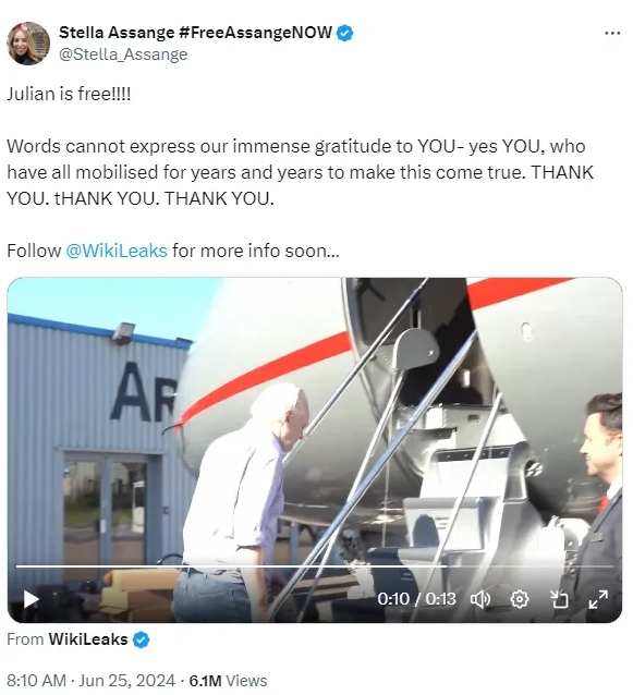 當?shù)貢r間25日,朱利安·阿桑奇的妻子斯特拉在社交媒體上激動地寫道,“言語無法表達我們對你們的感激之情——是的,就是你們,多年來,你們一直努力讓這一切成為現(xiàn)實。謝謝你們。謝謝你們,謝謝你們。”