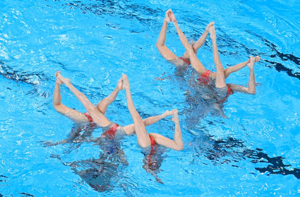 8月7日,中國(guó)花樣游泳隊(duì)在比賽中。新華社記者 夏一方 攝